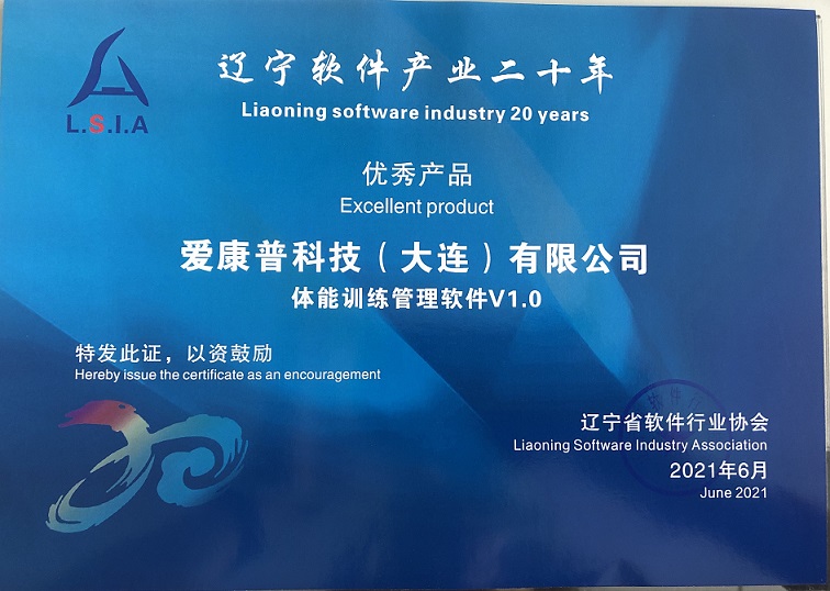 我司“愛康普體能訓(xùn)練管理軟件V1.0”榮獲“遼寧省優(yōu)秀軟件產(chǎn)品”稱號