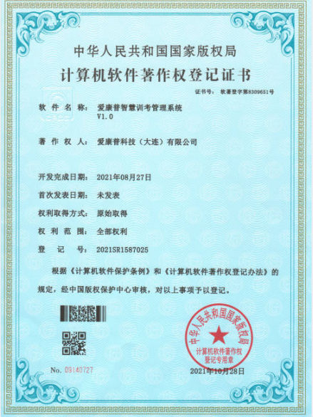 近日,由我公司自主研發(fā)的“愛康普智慧訓(xùn)考管理系統(tǒng)V1.0 ” ,“愛康普智慧訓(xùn)考系統(tǒng)V1.0”,“愛康普智慧訓(xùn)考展示系統(tǒng)V1.0”,榮獲中華人民共和國國家版權(quán)局計算機軟件著作權(quán)。截止至今,愛康普已獲得50項計算機軟件著作權(quán)及專利權(quán)。